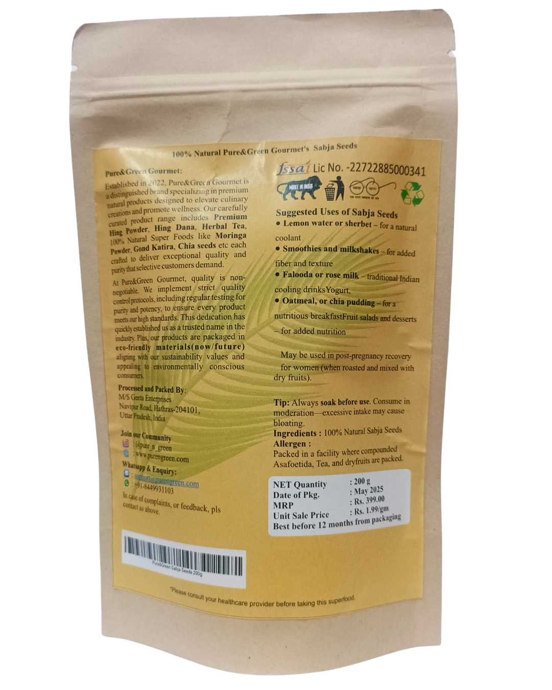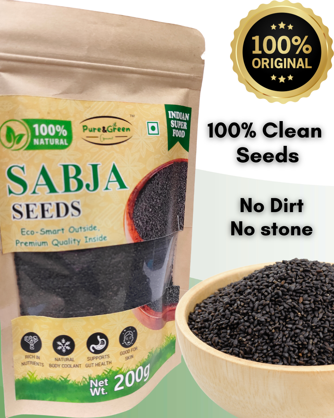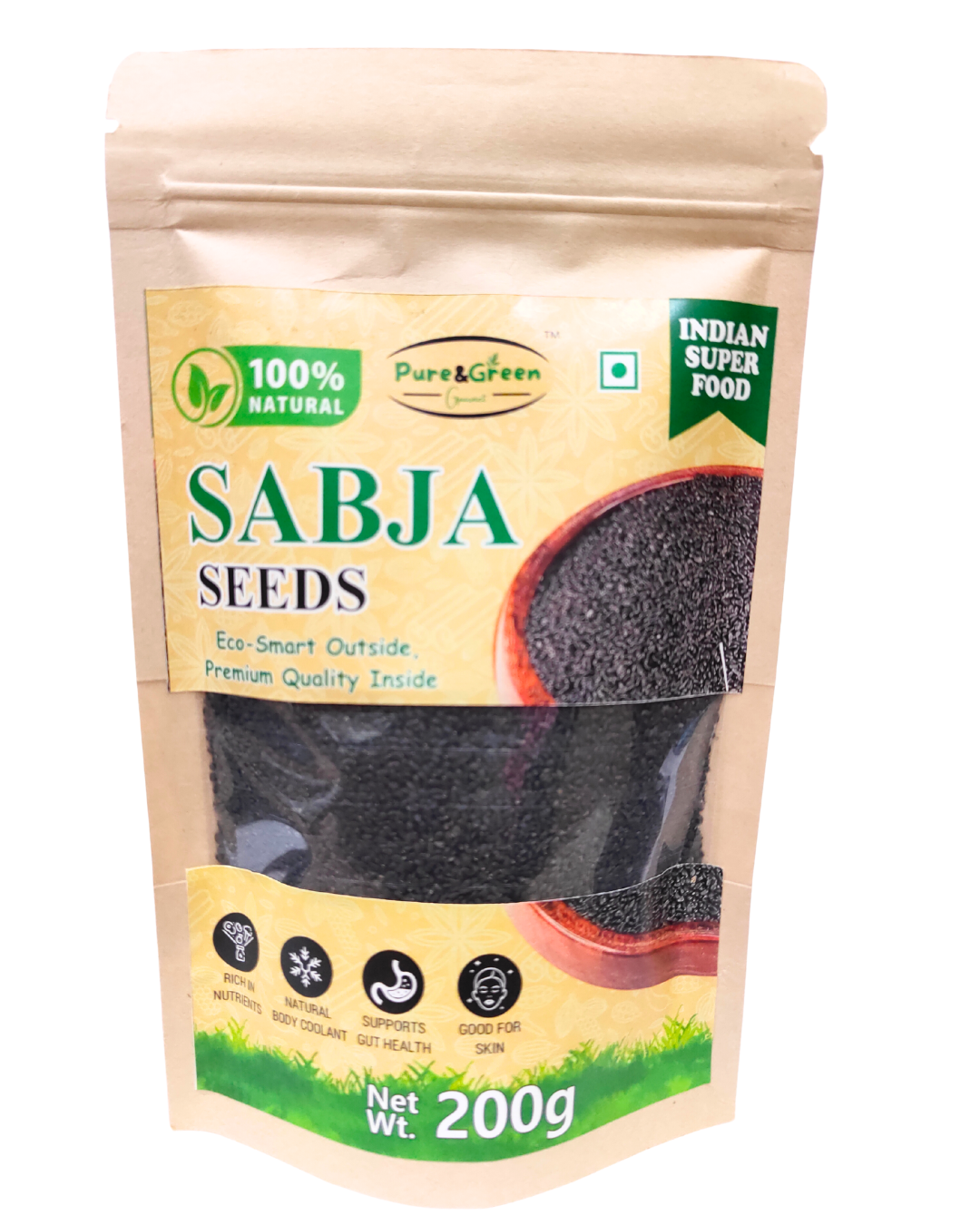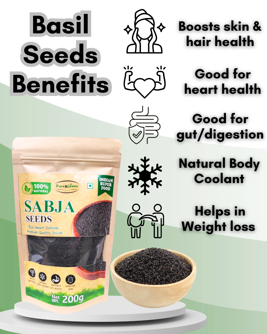 🌿 Pure&Green Premium Basil Seeds (Sabja Seeds) – 200g Superfood for Digestion, Weight Management & Summer Cooling Discover the natural wellness secret of India with Pure&Green Basil Seeds – also known as Sabja or Tukmaria. Sourced from high-quality basil plants, our seeds are 100% natural, unpolished, and free from additives — ideal for health-conscious individuals and Ayurvedic lifestyles.